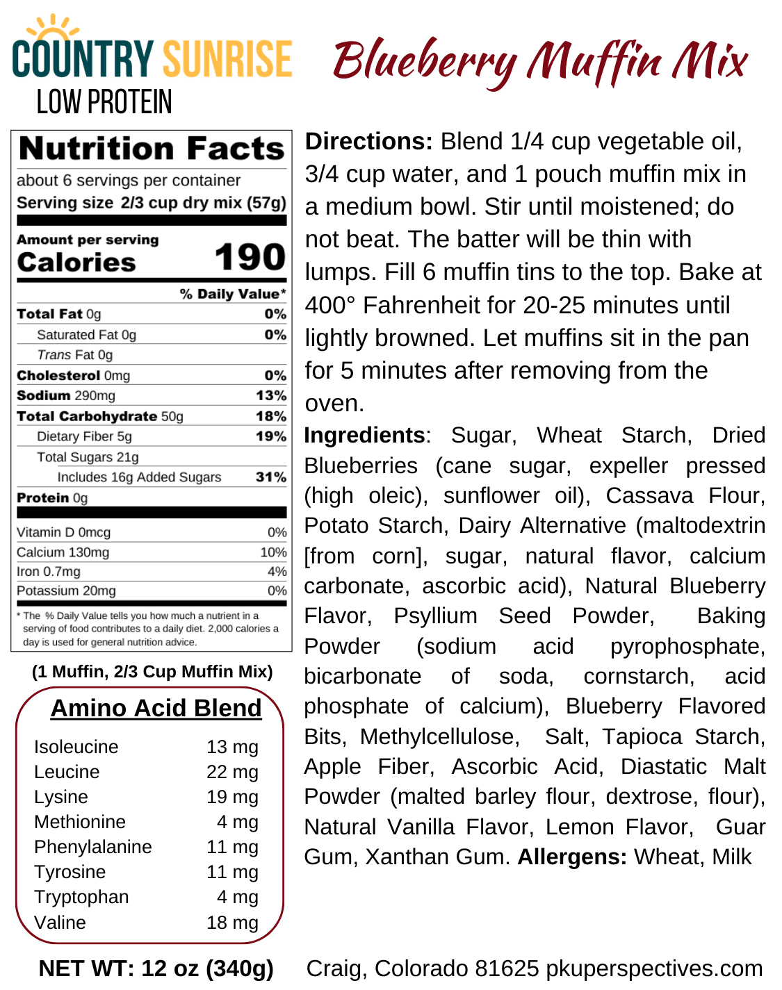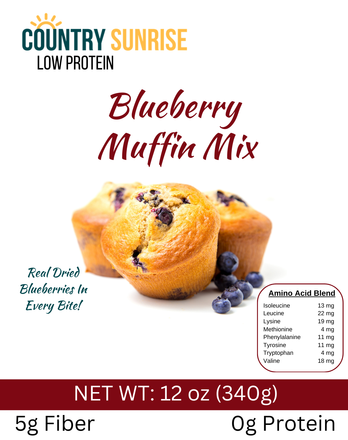Start your day with Country Sunrise low protein blueberry muffins, perfect for PKU, CKD (Chronic Kidney/Renal Disease), or any low protein diet. Made with real blueberries, they are easy to prepare—just add water, oil, stir, and bake. These muffins are a healthy choice, offering 5g of dietary fiber, Calcium, and Iron.