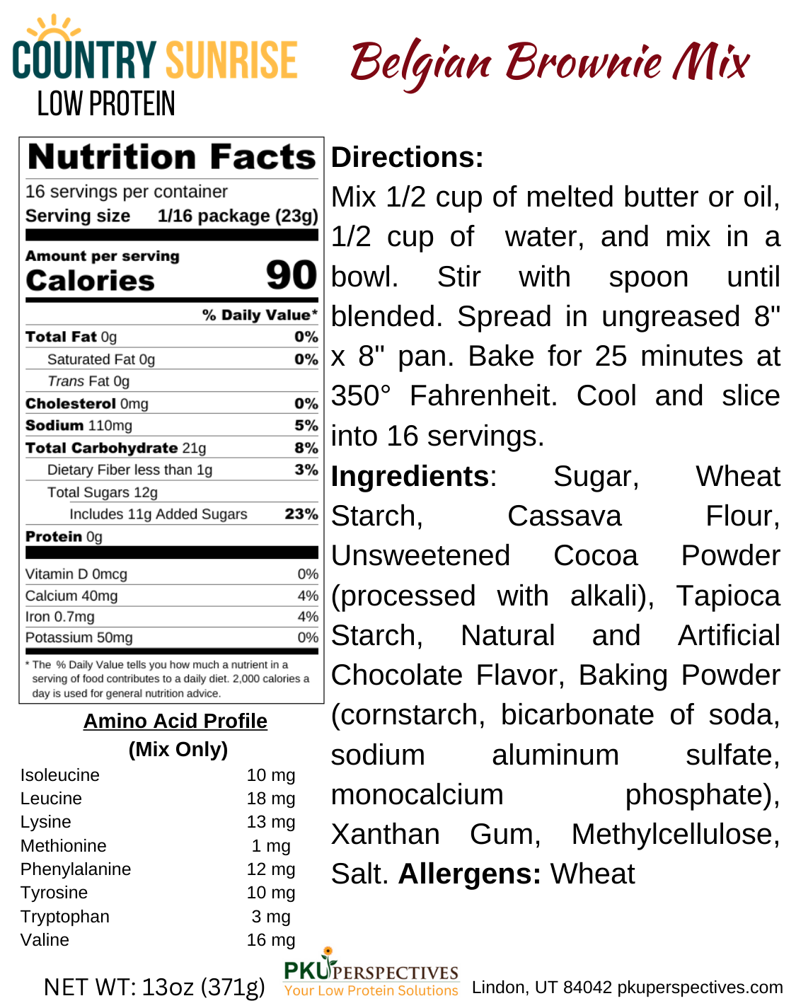 Our chewy, moist low-protein brownies are made with real Belgian cocoa. Made in an 8″ x 8″ pan and each pouch bag contains 16 delicious brownies. They are rich in fiber and include three essential vitamins.