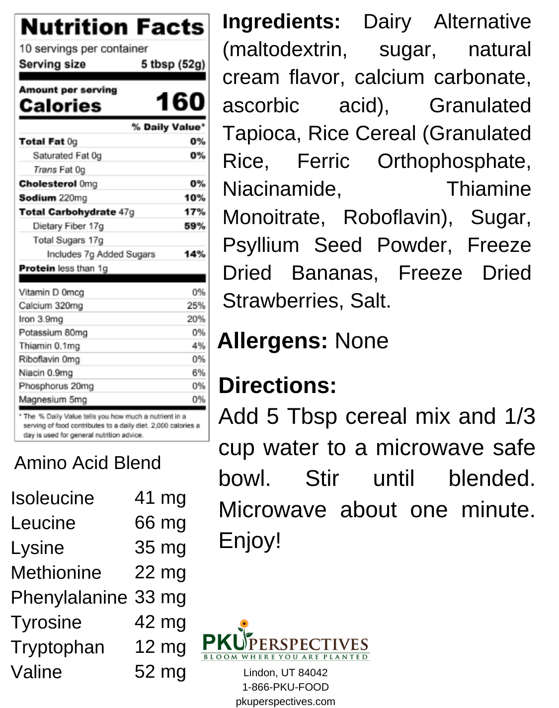 Serving Size: 52g 1 Bowl Protein: Less than 1g PHE: 33mg