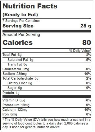 Ingredients: Filtered Water, Olive Oil*, Potato Starch, Tapioca Starch, Faba Protein, Natural Flavors (Vegan Sources), Sea Salt, Dextrose, Calcium Citrate, Carob Bean Gum, Xanthan Gum, Annatto and Turmeric Extracts (Color), Powdered Cellulose Added to Prevent Caking. *adds a trivial amount of saturated fat