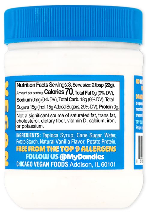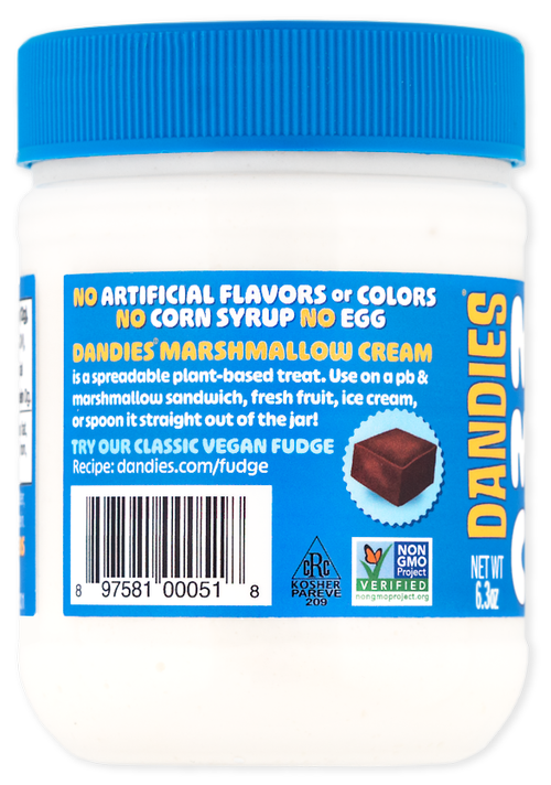 Dandies® Marshmallow Cream is a spreadable plant-based treat. Use on a pb & marshmallow sandwich, fresh fruit, ice cream, or spoon it straight out of the jar!