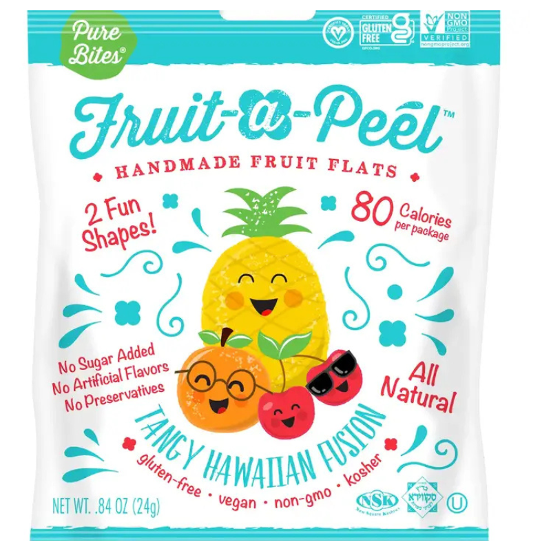 Fruit-a-Peel is a fun shaped handmade fruit leather that is kosher, gluten free, non-gmo, low protein and vegan.