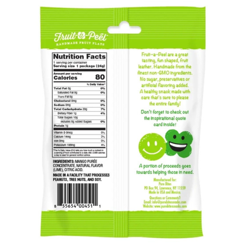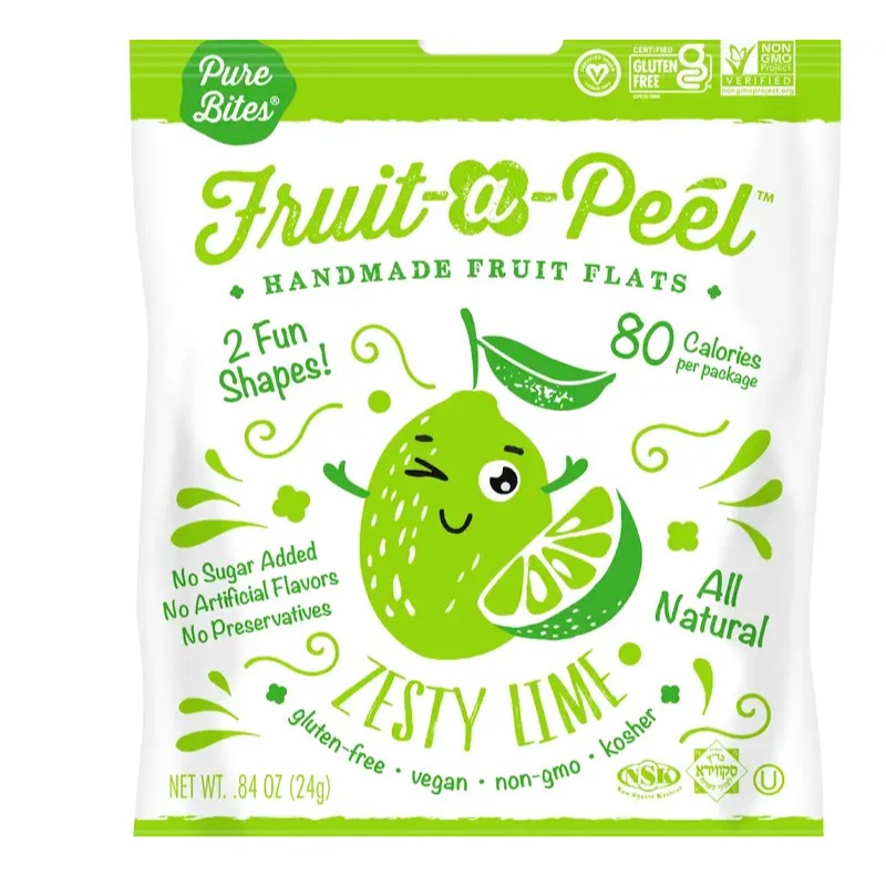 Fruit-a-Peel is a fun shaped handmade fruit leather that is kosher, gluten free, non-gmo, low in protein and vegan. A zesty burst of sour lime flavor! This flavor is bold, distinct and unique. Tropical fun with a tangy twist! A sub-lime snack for your lunch, road trip, or any time treat!