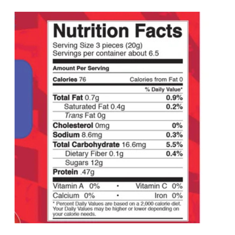 Ingredients:Â SUGAR, GLUCOSE SYRUP, WHEAT FLOUR, WATER, VEGETABLE OIL, MALIC ACID, ACIDULANT (CITRIC ACID), ARTIFICIAL FLAVORS, ARTIFICAL COLORS (TITANIUM DIOXIDE, RED 40), EMULSIFIER. DOES NOT CONTAIN GELATIN. ALLERGEN INFORMATION: CONTAINS GLUTEN.