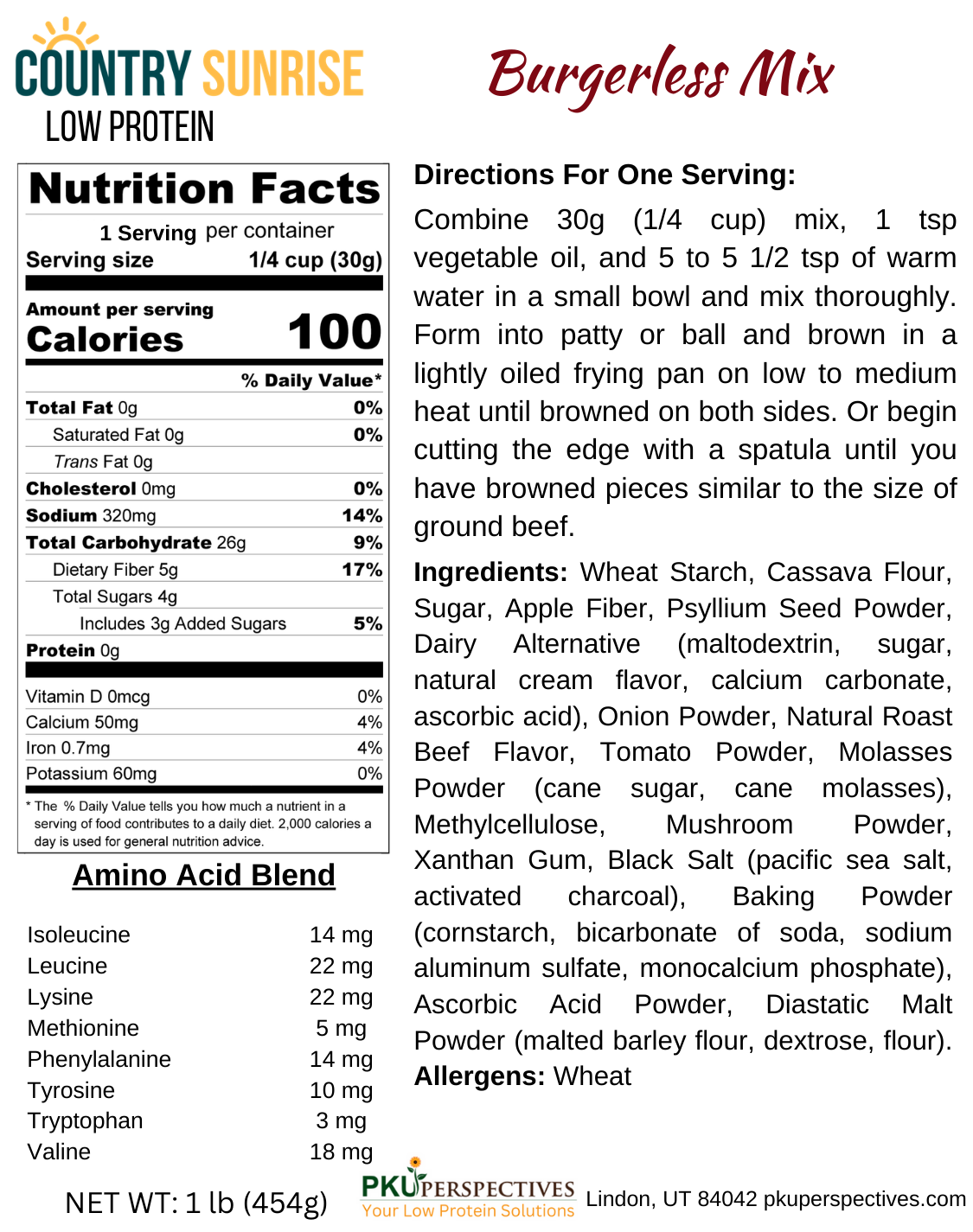Single serving low protein burger mix perfect low protein food for your PKU or CKD (Chronic Kidney/Renal Disease) or any low protein diet.