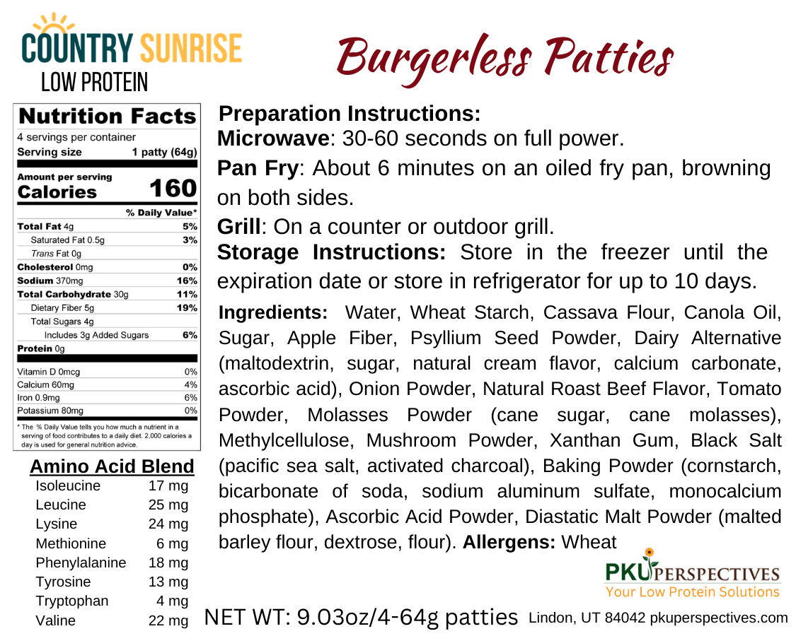Country Sunrise Burgerless Patties – 4/64gLow protein burger patties are the perfect low protein food for your PKU or CKD (Chronic Kidney/Renal Disease) or any low protein diet.Storage Instructions: Store in the freezer until the expiration date or store in refrigerator for up to 10 days.