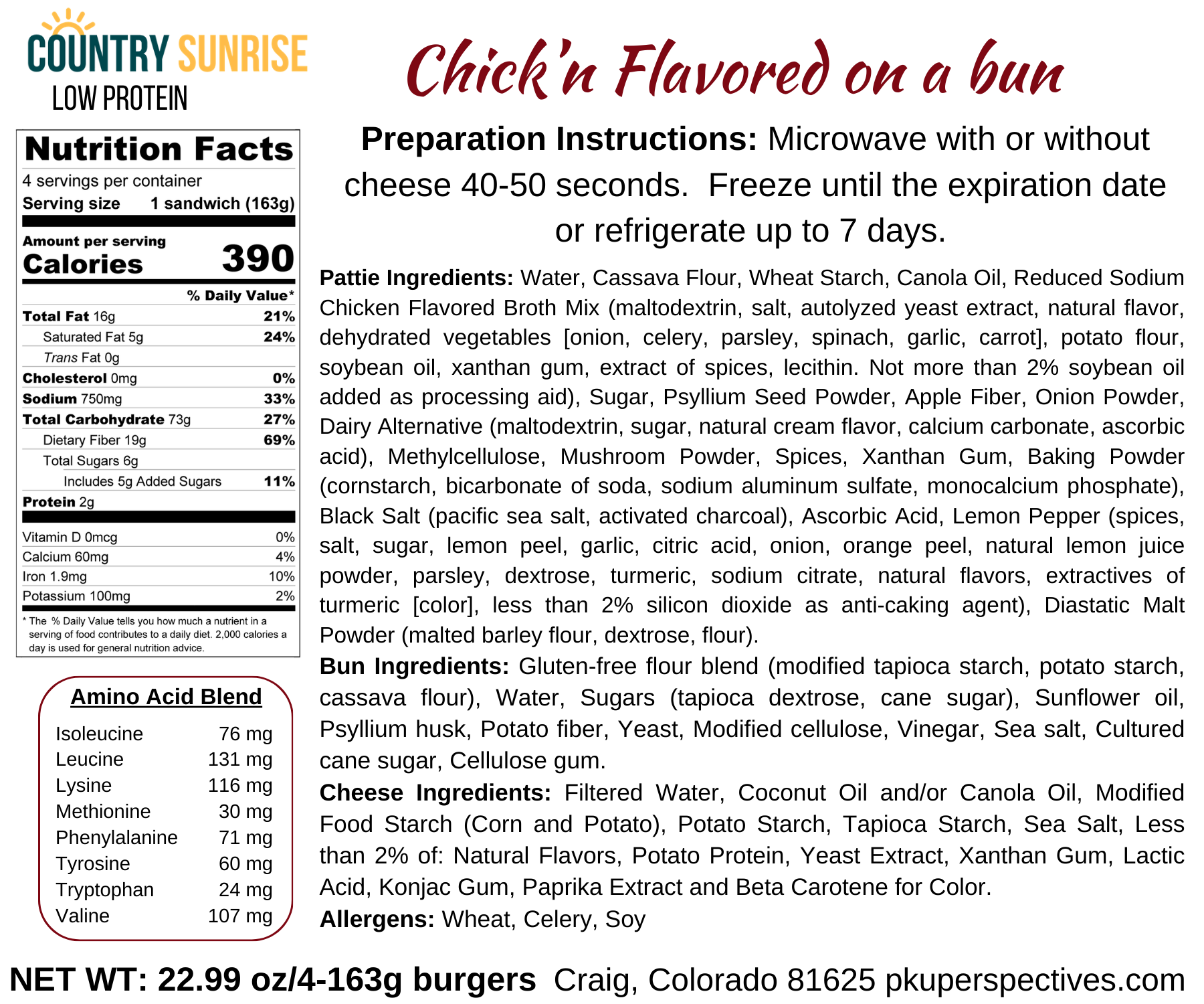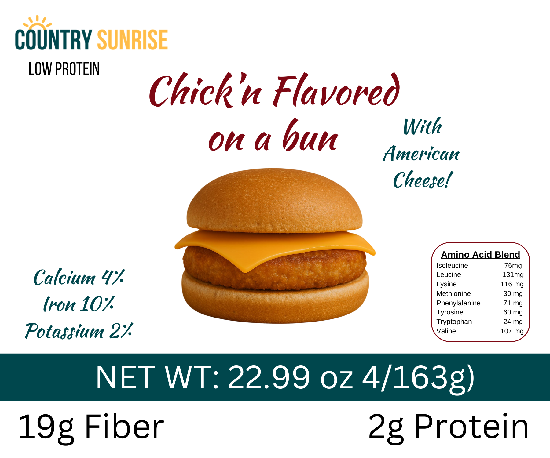 Country Sunrise Chick’n (Flavored) on a bun- 4/163gThe Country Sunrise Chick’n (flavored) on a bun with cheese is a unique, low-protein alternative to the classic chicken sandwich. Made with a favorite Country Sunrise Chick’n (flavored pattie), it’s flavorful and low in protein. It features a gluten-free, low-protein bun and dairy-free American cheese, perfect for low-protein diets. Customize it with your favorite low-protein condiments. Microwave or grill it for a tasty meal option. Toast the bun for added crunch and flavor. Enjoy a delicious meal that meets your dietary needs.