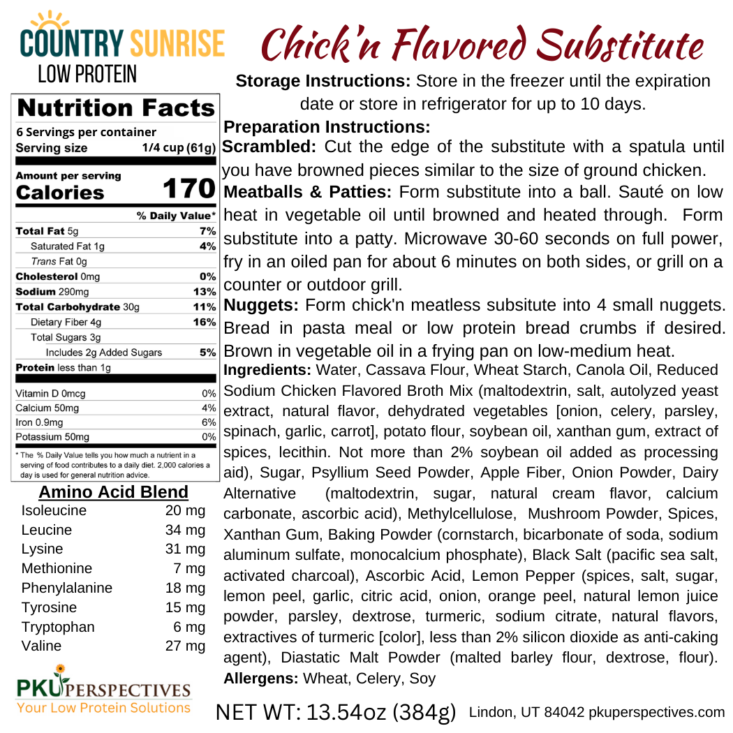Country Sunrise Chick’n (Flavored) Ready To Eat Substitute- 12.91ozOur low protein Country Sunrise Chick’n ready to eat substitute is perfect for burgers, meatballs, nuggets, or scrambled dishes. Simply microwave, pan fry, or grill. Made with canola oil, which provides omega-3 ALA. Packaged in a resealable vacuum-sealed bag, it’s ideal for PKU,allied disorders, renal disease (CKD), and other low protein diets. Contains 4g fiber, dairy-free, and no MSG. 4% calcium, 6% iron making it a part of your health low protein diet. Â