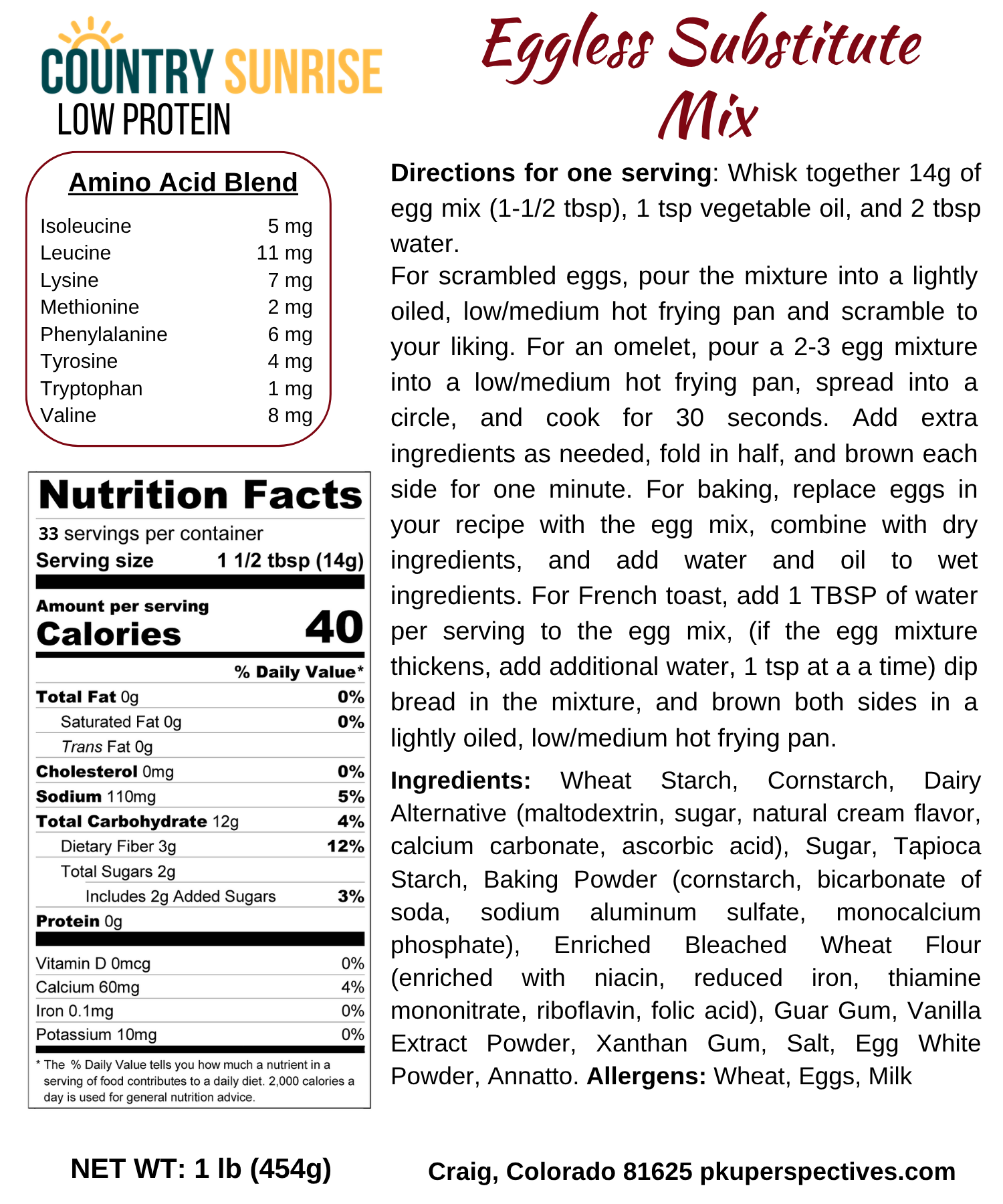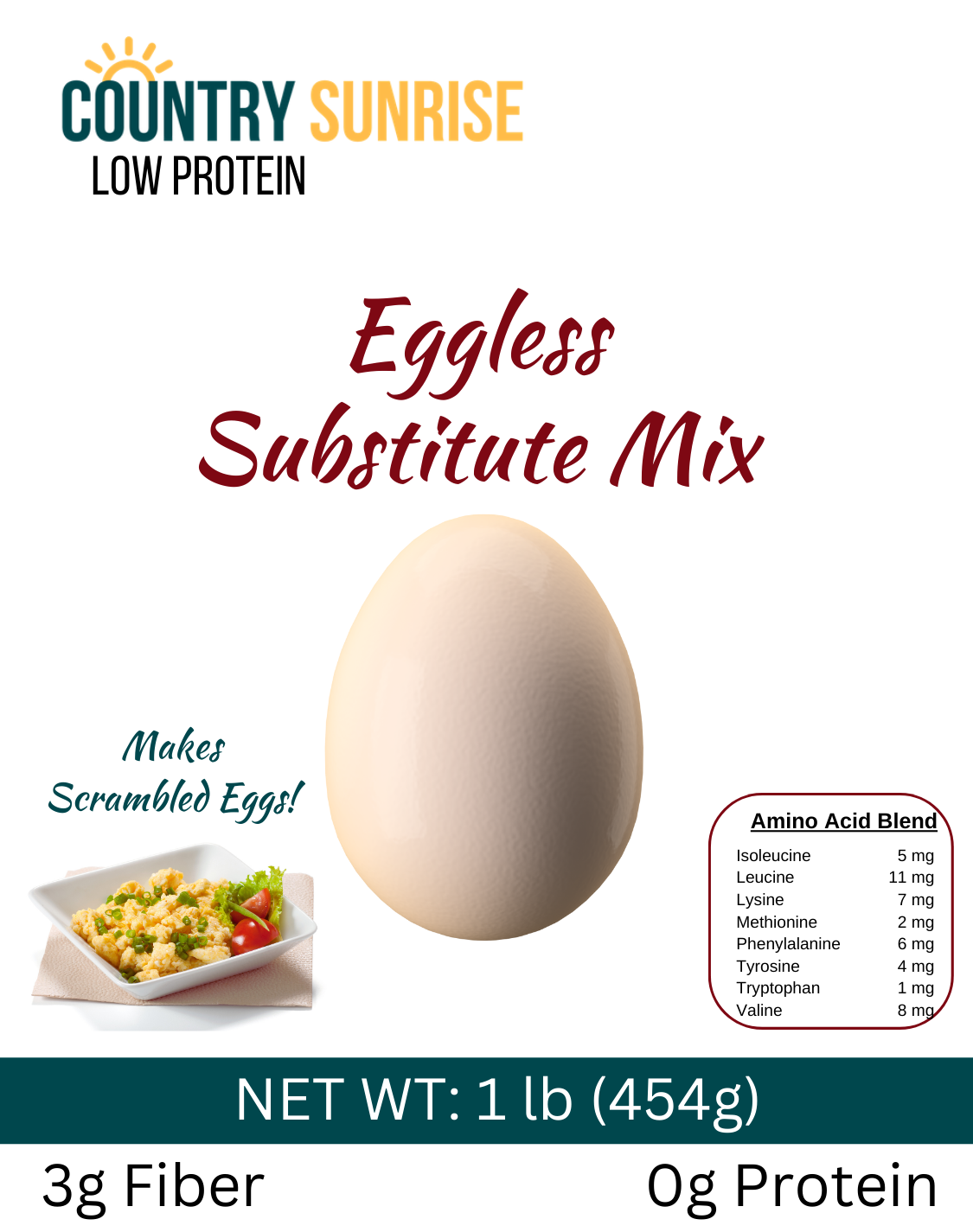 Country Sunrise low protein Eggless Substitute mix is perfect for low protein diets like PKU and CKD. Make scrambled eggs, egg salad, French toast, or omelets with veggies. It’s also great for baking low protein muffins, cookies, cakes, and pancakes. This versatile, mix works in various recipes calling for eggs. One serving equals one egg.