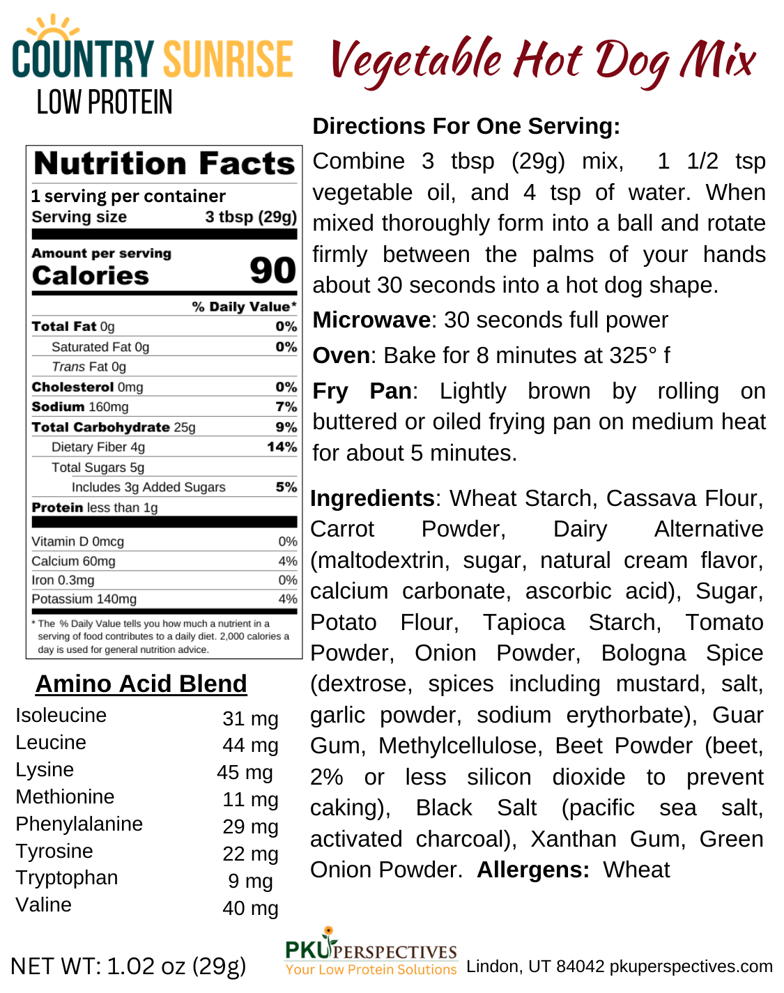 Low protein single serve Vegtable Hot Dog mix packet is great for travelling, picnics, camping or grandma’s house. Take them anywhere!Â