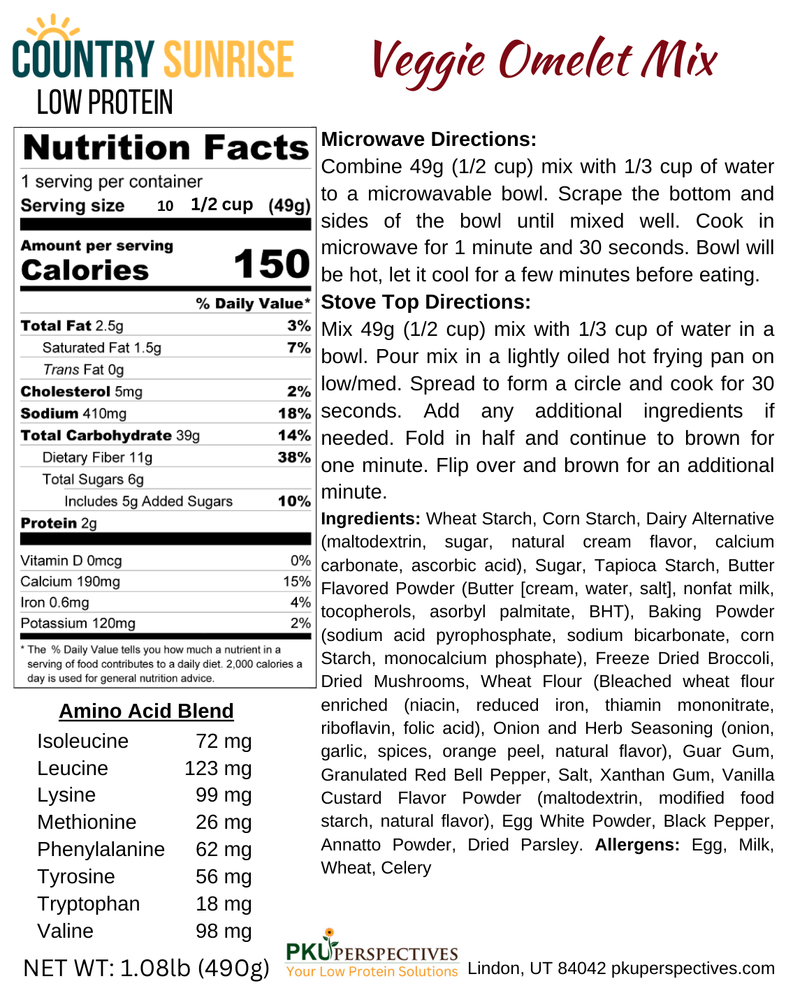 Take a minute to prepare and enjoy a low protein breakfast with the NEW Country Sunrise Veggie Omelet Mix.