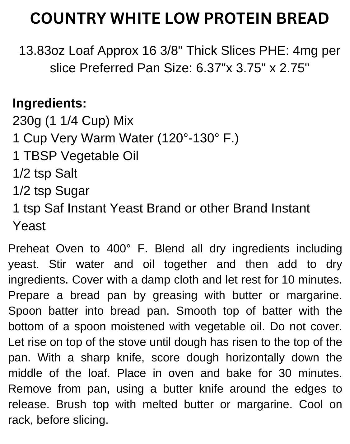- Prepared Bread Loaf: 13.83oz Loaf Approx 16 ⅜” Slices PHE: 4mg per 24.5g slice