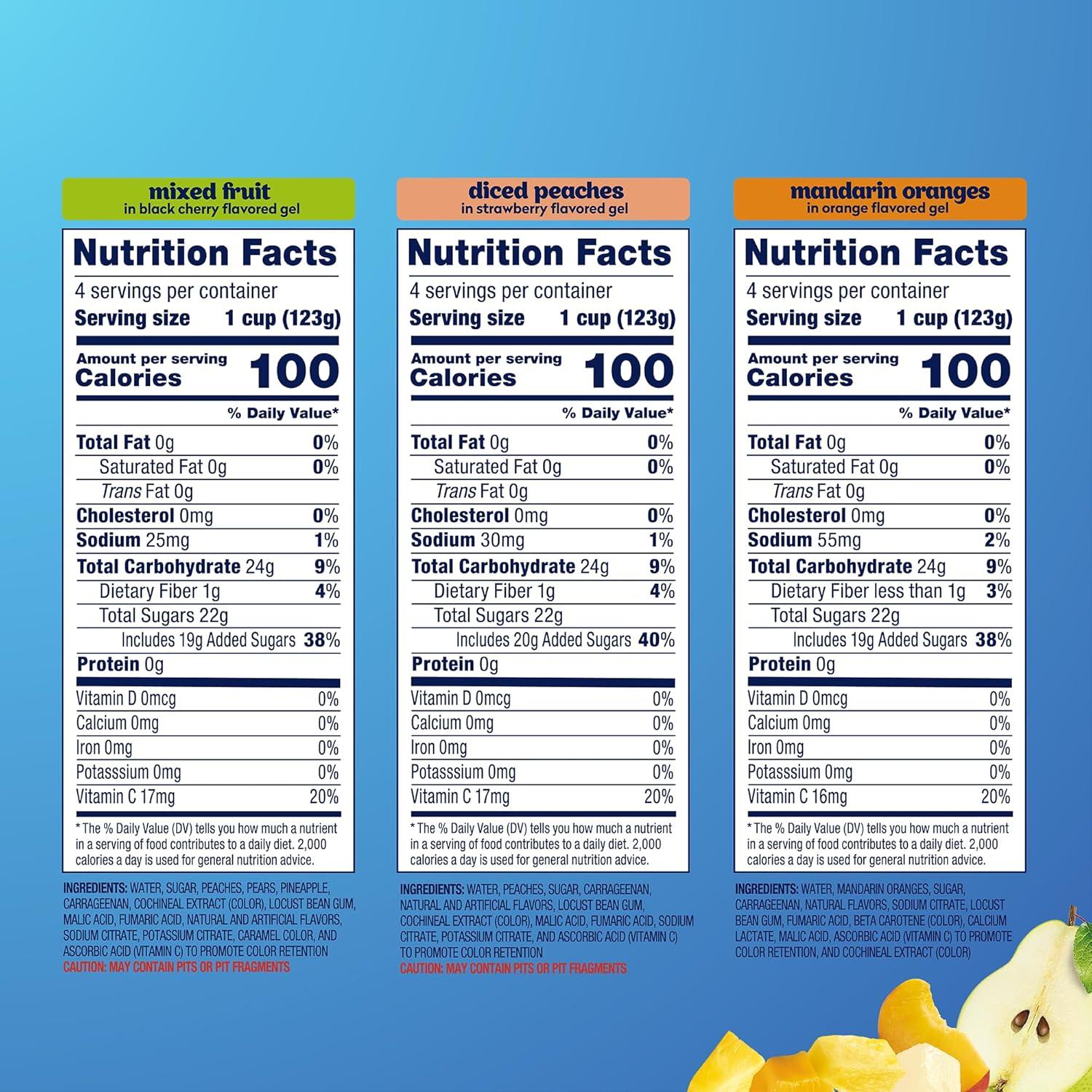 Mandarin Oranges in Oragnge Flavored Gel: WATER, MANDARIN ORANGES, SUGAR, CARRAGEENAN, NATURAL FLAVORS, SODIUM CITRATE, LOCUST BEAN GUM, FUMARIC ACID, BETA CAROTENE (COLOR), CALCIUM LACTATE, MALIC ACID, ASCORBIC ACID (VITAMIN C) TO PROMOTE COLOR RETENTION, AND COCHINEAL EXTRACT (COLOR). Diced Peaches in Strawberry Gel: WATER, PEACHES, SUGAR, CARRAGEENAN, NATURAL AND ARTIFICIAL FLAV ORS, LOCUST BEAN GUM, COCHINEAL EXTRACT (COLOR), MALIC ACID, FUMARIC ACID, SODIUM CITRATE, POTASSIUM CITRATE, AND ASCORBIC ACID (VITAMIN C) TO PROMOTE COLOR RETENTION. Mixed Fruit in Black Cherry Gel: WATER, SUGAR, PEACHES, PEARS, PINEAPPLE, CARRAGEENAN, COCHINEAL EXTRACT (COLOR), LOCUST BEAN GUM, MALIC ACID, FUMARIC ACID, NATURAL AND ARTIFICIAL FLAVORS, SODIUM CITRATE, POTASSIUM CITRATE, CARAMEL COLOR, AND ASCORBIC ACID (VITAMIN C) TO PROMOTE COLOR RETENTION.