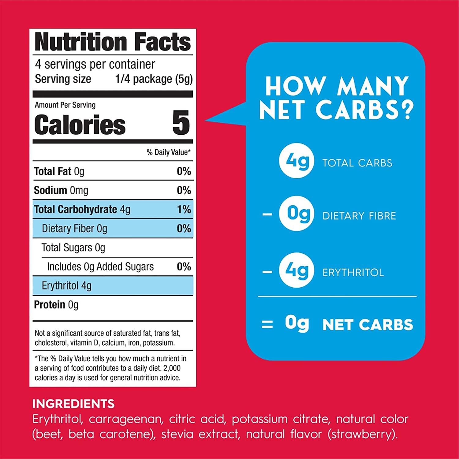 INGREDIENTS:Â Erythritol, carrageenan, citric acid, potassium citrate, natural color (beet, beta-carotene), natural flavor (strawberry), stevia extract.