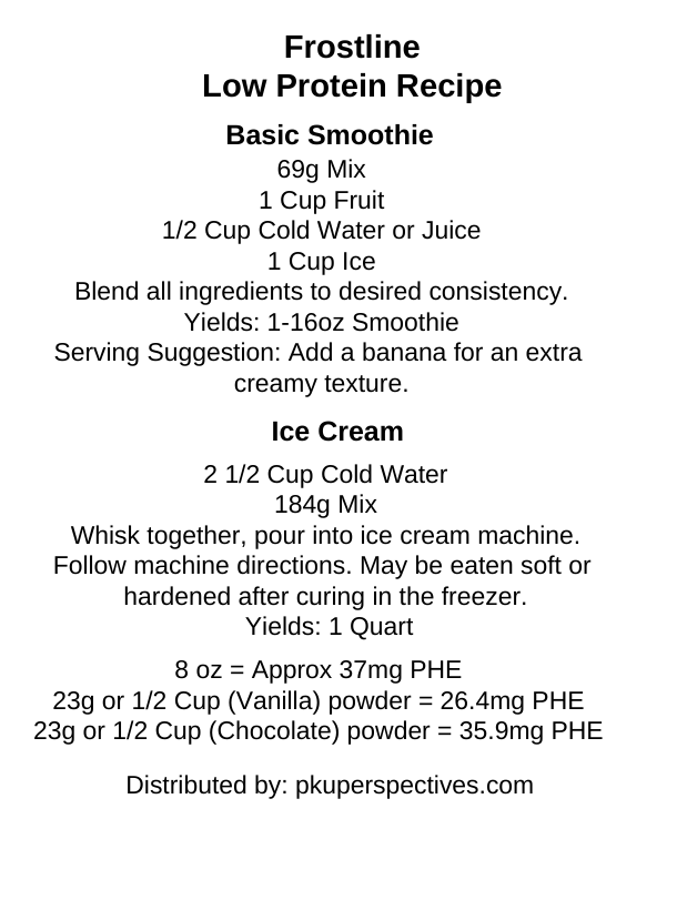 Protein:1g/1/2 cup serving. PHE: 35.9mg/1/2 Cup serving prepared as ice cream.