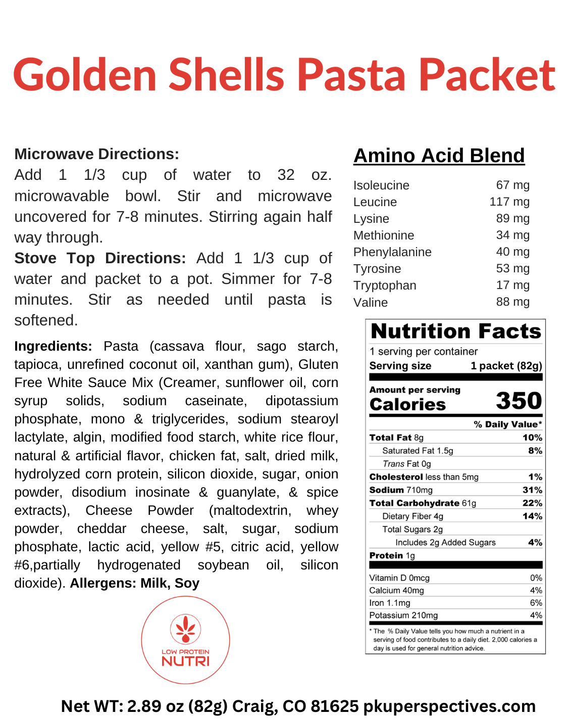 Low Protein Nutri Golden Shells Pasta Packet- 2.89oz