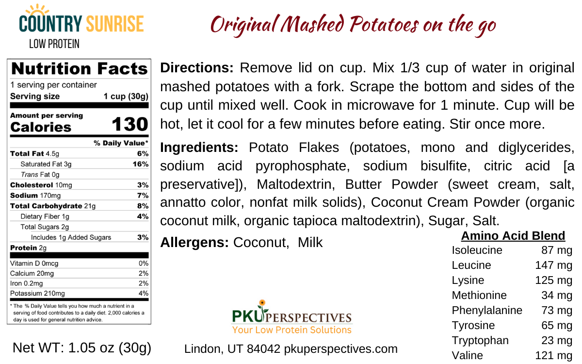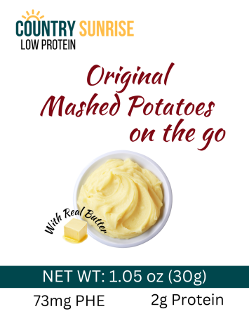 Single serving mashed potatoes on the go cup is the perfect low protein food for your PKU or CKD (Chronic Kidney/Renal Disease) diet.