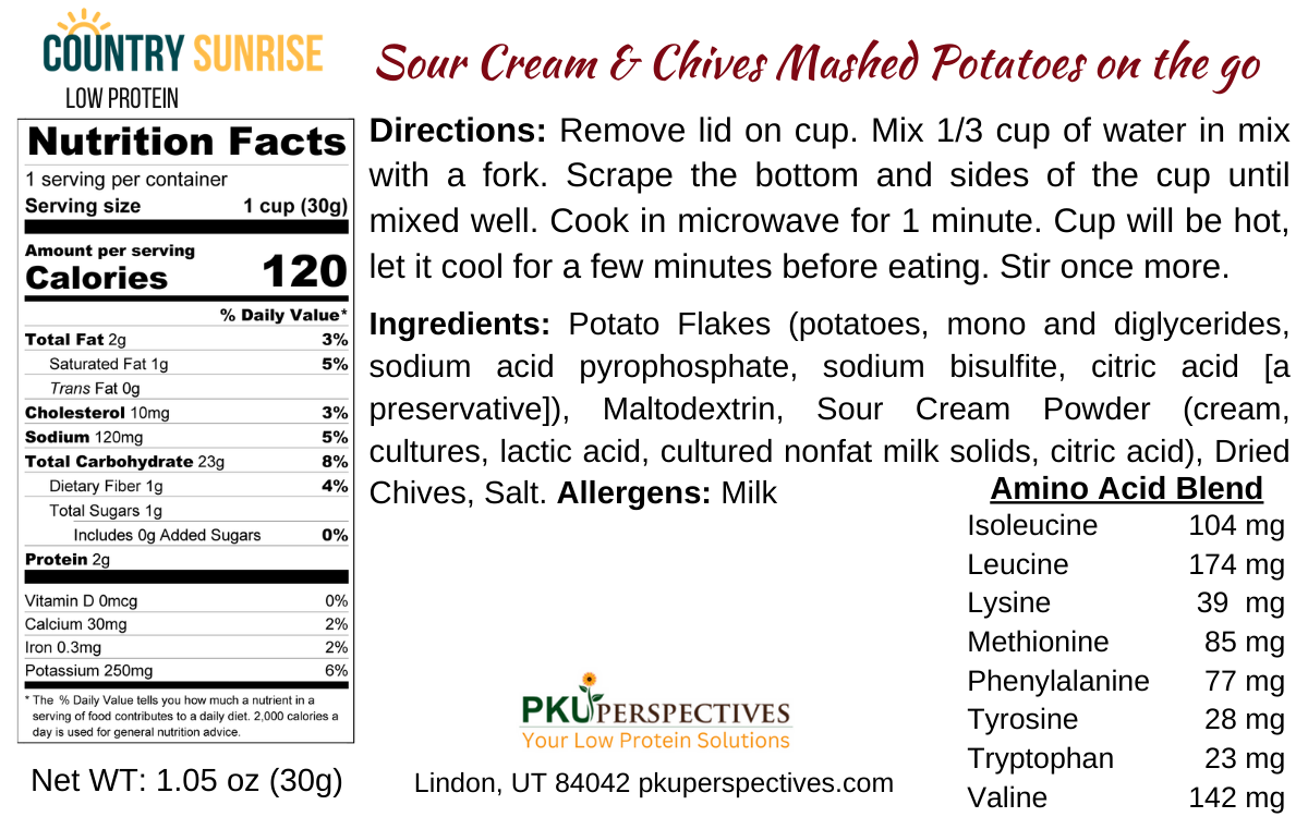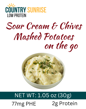 Single serving mashed potatoes on the go cup is the perfect low protein food for your PKU or CKD (Chronic Kidney/Renal Disease) diet.