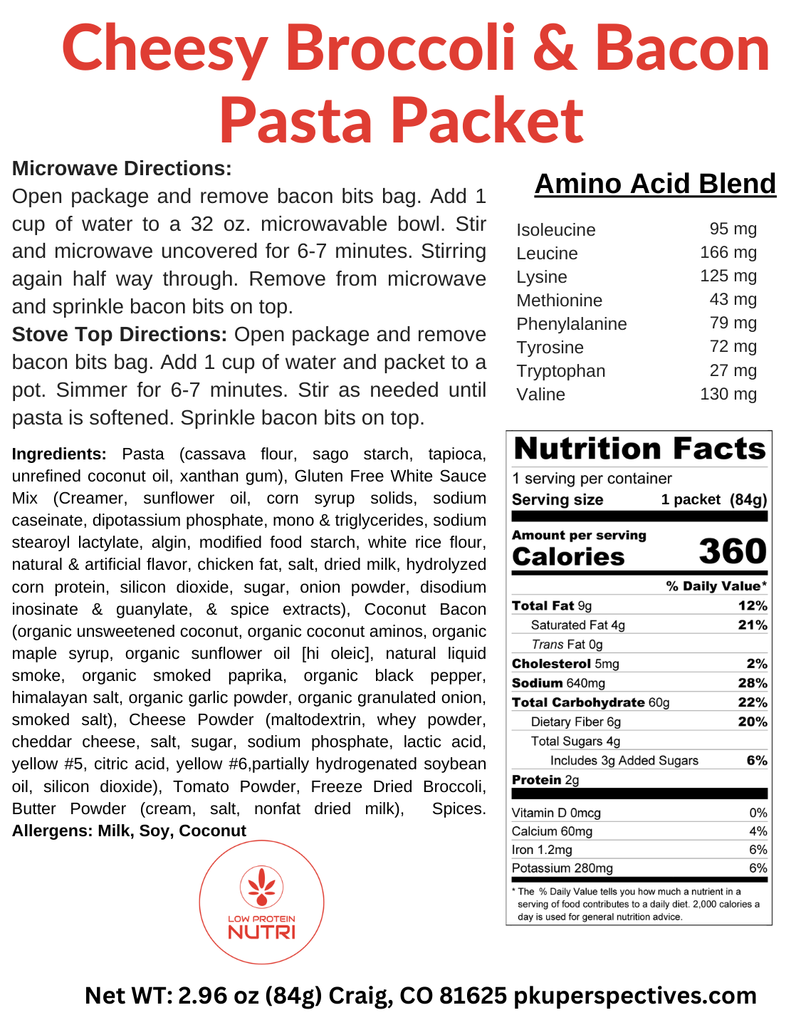 Low Protein Nutri Cheesy Broccoli & Bacon Pasta Packet-2.96ozLow Protein Nutri Cheesy Broccoli & Bacon Pasta Packet-2.96oz