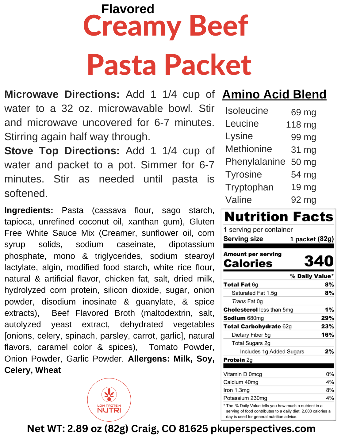Low Protein Nutri Creamy Beef (Flavored) Pasta Packet- 2.89oz