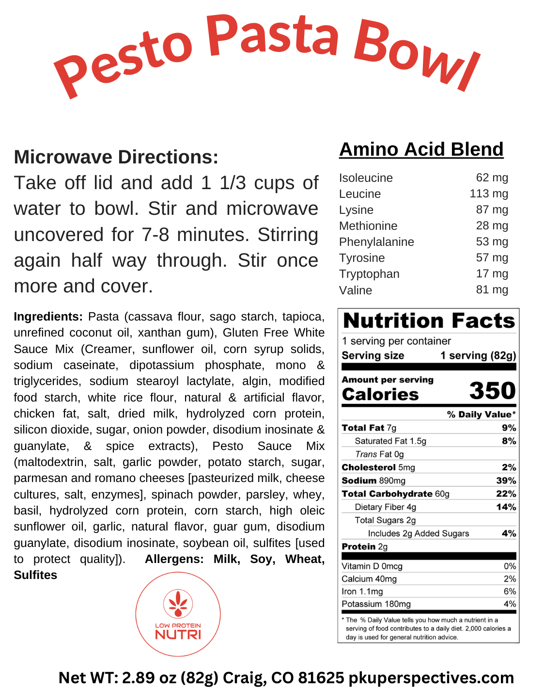 Low Protein Nutri Pesto Pasta Bowl- 2.89oz