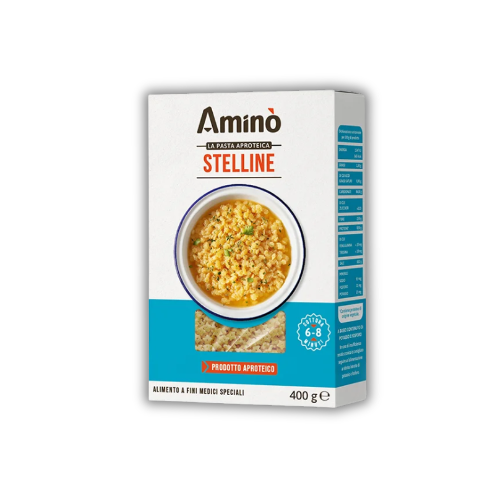 Amino Stelline are delicious low-protein pasta from Italy. Amino pasta is made from starch specifically for low-protein diets and is therefore very suitable for diets with a low and controlled intake of phenylalanine.