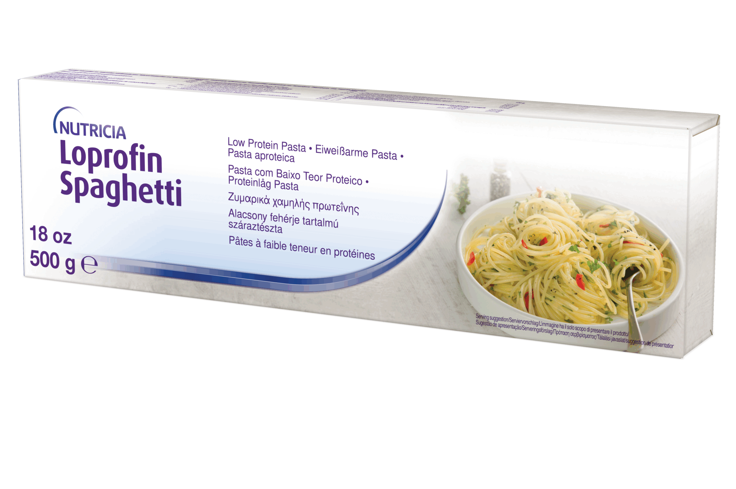 Loprofin Spaghetti Low protein pasta for your favorite pasta dishes in 9 popular shapes. Gluten-free, Wheat-free, Peanut-free, Milk-free, Egg-free, Soy-free.