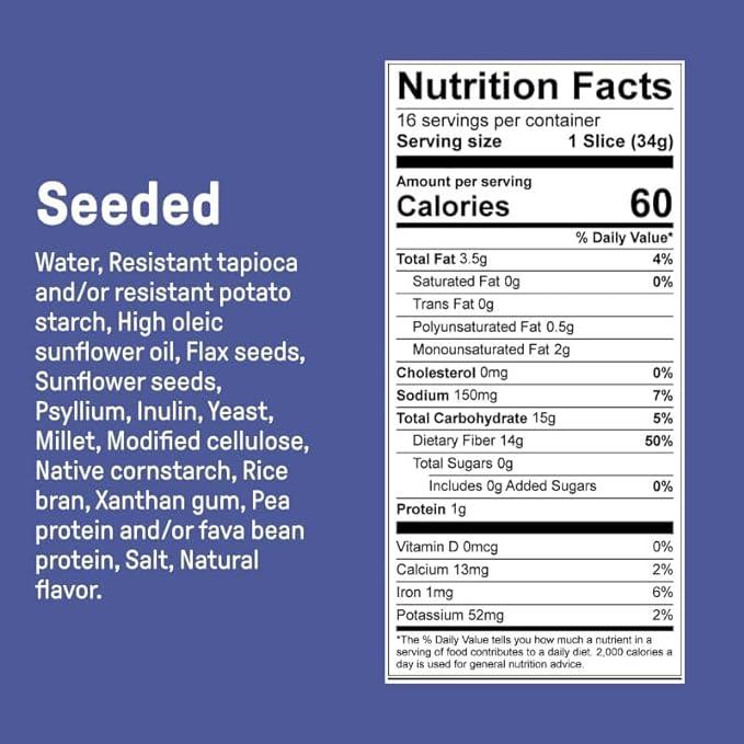 Ingredients:Â Resistant tapioca and/or resistant potato starch, Water, High oleic sunflower oil, Flax seeds, Sunflower seeds, Psyllium, Inulin, Pea protein and/or fava bean protein, Salt, Yeast, Millet, Modified cellulose, Native cornstarch, Rice bran, Xanthan gum, Natural flavor.