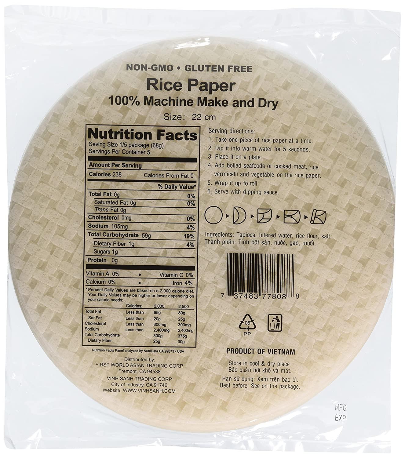 A fun way to enjoy your veggies… Secrets of great Spring/Summer rolls are to use the freshest ingredients available, to moisten the rice-paper wrappers until they are pliable but not too wet, and to roll the bundles tightly. The beauty of spring rolls is that you can add just about any ingredients you would like. Vegetables should be either lightly steamed or sautÌ©ed and sliced into thin slivers. If you are using cellophane noodles, it works best to break them in half before cooking so they are not too long. Fresh herbs are wonderful to use in spring rolls as well. The trick is to wrap the veggies as tightly as you can, and keep all the ingredients long so they don’t fall out. Size: 22 cm. (81/2″) Machine made and dried. Shelf stable. One 12 oz pack has about 30 sheet of rice papers. Easy to prepare. Just wet and use. Soften rice paper by quick evenly dipping in cold or warm water for 5-10 seconds. Lay flat on a plate. It is ready for wrapping your favorite sauteed vegetables, herbs, cellophane noodles…etc. Enjoy with a sweet and sour fruit dipping sauce. Ingredients: tapioca starch, water, rice flour, & salt
