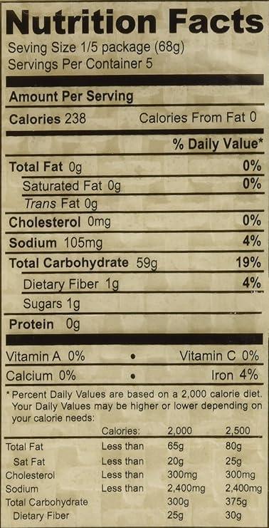 - Per Serving :238 calories, calories from fat :0 , Cholesterol: 0%, Sodium:4%, Dietary Fiber: 4%, sugar:1%, Iron:4%