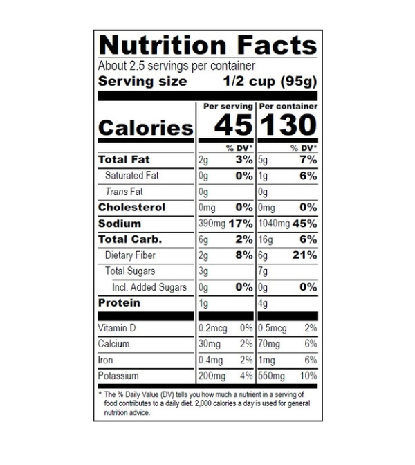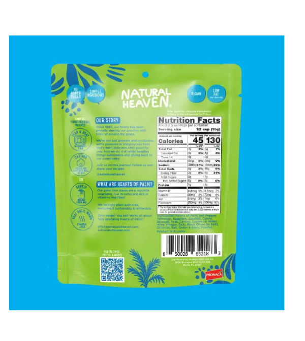 Ingredients: Hearts of palm, olive oil, green pepper, lentils, white bean, chickpea, quinoa, red pepper, tomatoes, white vinegar, sea salt, citric acid, and seasonings.