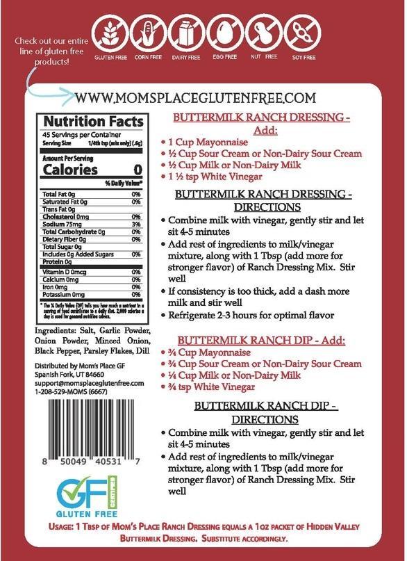 Mom’s Place Gluten-Free & Dairy Free Ranch Dressing Mix- 1oz