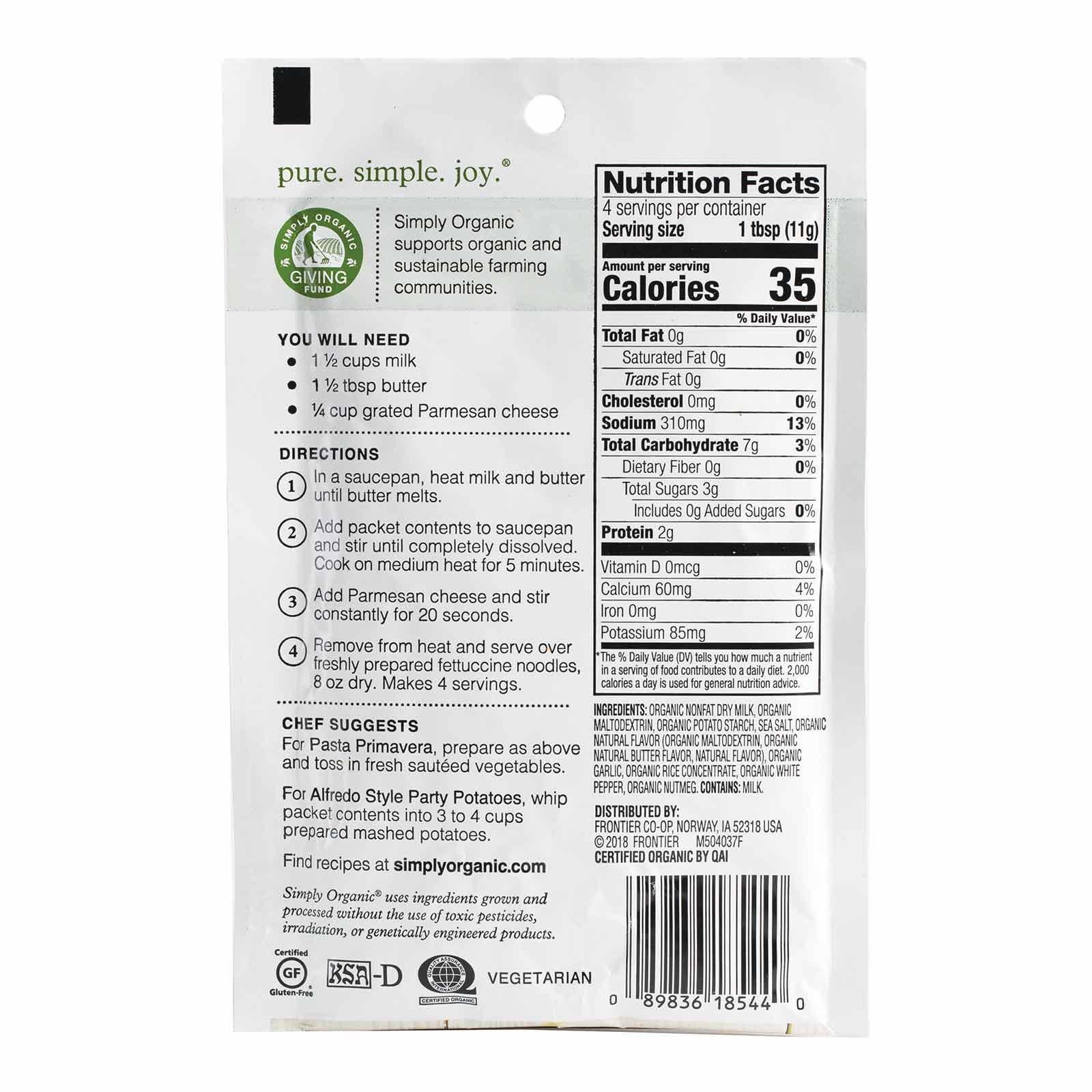 For pasta made perfect, Simply Organic® Alfredo Sauce Mix provides the classic creamy texture and authentic Italian flavor you know and love. The savory flavors of garlic, white pepper and nonfat dry milk pair perfectly with milk, Parmesan cheese and a dollop of butter to create a creamy white sauce in less than 10 minutes.